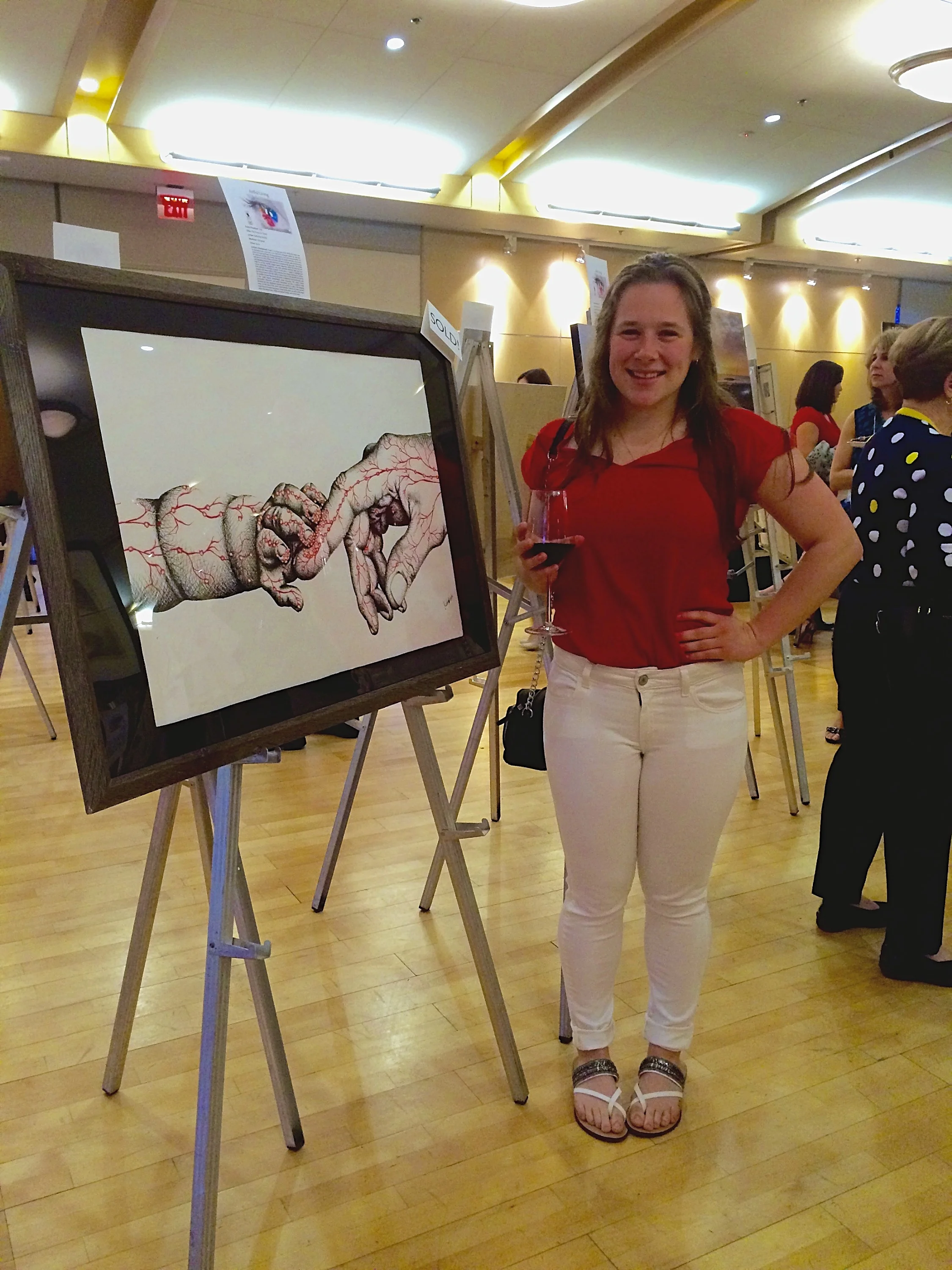 Description delivered with piece: Touch is a critical part of life. While this sense may be de-emphasized or ignored in our daily lives, its impact within our body and mind is no less significant. Trust and communication can be achieved verbally and visually. But rarely do people realize the power of touch. Within our bodies, we have a complex network of neurons and signaling pathways that allow us to physically communicate. A simple high-five or hug actually triggers neural responses within the body that can induce adrenaline, happiness, and other powerful emotions that may have been difficult to articulate in words. In this piece, I wanted to highlight how dynamic this sense really is. This newborn is not simply touching his mother, the firing neurons allow the child to form a bond of unimaginable strength to his mother. Science has shown this touch, mediated by neurons through only a few small fingers, immediately starts impacting this child’s future behaviors and social interactions. In turn, a mother’s body develops her own physical response and reaction to such a life-changing event. At this time of life when communication barriers are most present, touch shows its unwavering power. I hope in this piece one will see the beauty within the human body, within our natural biology, and within touch.